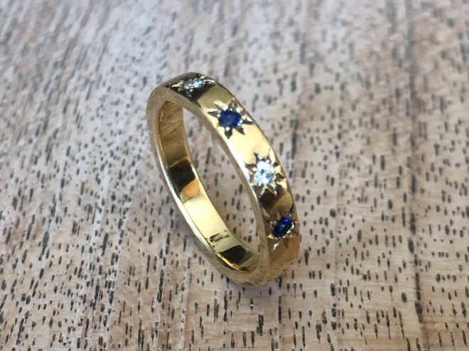 Hand forged, 4mm band, flush set with 2.25mm blue sapphires and diamonds. If not in stock, please allow 2-3 weeks to make as each piece is handmade.